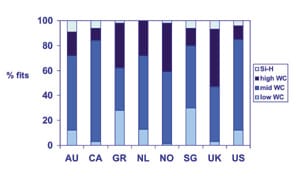 Mid water (40 percent to 60 percent) lenses were the most popular soft lens material, accounting for 80 percent of new soft lenses prescribed in Canada (Figure 2). Low water (less than 40 percent water) contact lenses accounted for only 1 percent of lenses in Norway, but remain common in Singapore (31 percent) and Greece (28 percent). Silicone hydrogel materials were more commonly used for refits, representing 18 percent of lenses in Norway and 15 percent in Australia.