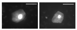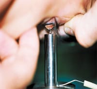 In a prospective study, the effect of wearing time (daily wear and six nights vs. 30 nights EW), lens oxygen transmissibility (high vs. hyper) and contact lens type (soft vs. GP) on contact lens-induced bacterial binding to corneal epithelial surface cells was examined for the study duration of one year. Four test lenses were used in a study group totaling several hundred patients: a high oxygen transmissible disposable contact lens (Acuvue, Vistakon), two hyper oxygen transmissible silicone hydrogel lenses (PureVision, Bausch & Lomb and Focus Night & Day, CIBA Vision) and one hyper oxygen transmissible gas permeable lens (Menicon Z, Menicon). In order to measure bacterial binding, it is necessary to harvest corneal epithelial cells. Figure 1 shows an irrigation chamber used in the clinic to rinse the cornea and collect surface epithelial cells from one eye of each patient. These collected cells were then mixed in the laboratory with Pseudomonas aeruginosa bacteria, the most common and devastating infection agent associated with lens-related microbial keratitis. Following several staining and washing procedures, the epithelial cells were visualized under a microscope, and subsequently a masked observer determined the number of adherent bacteria per cell (Figure 2) for each individual prior to and following contact lens wear.