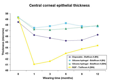 The corneal epithelium forms, together with the conjunctival epithelium, the outer layer of the ocular surface. The integrity of this layer is essential in protecting the deeper structures of the eye against infection and mechanical damage. Holden et al were the first to show in human patients that long-term EW contact lens wear significantly thins the corneal epithelium by 5.6 percent (Holden 1985). This classic paper was published before the use of hyper transmissible GP and silicone hydrogel lenses, thus the question remained: "Do these new lenses also cause a significant thinning?" We have measured with in vivo confocal microscopy the thickness of the central corneal epithelium before enrollment in the study (baseline, point 0) and during DW/EW.