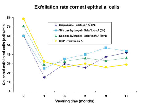 Every day, the corneal epithelium is continuously losing surface cells into the tear film through a process called exfoliation. Apoptosis, a form of cell suicide, is believed to regulate this process as mostly single cells are being deleted from the ocular surface in an orderly manner (Ren 1996). Exfoliation of surface cells into the tear film is part of the ocular defense system, which makes it more difficult, for example, for bacteria adherent to surface epithelial cells to stay for prolonged periods of time. The surface epithelial exfoliation rate (cells/minute) can be estimated prior to lens wear and after DW/EW using the same irrigation chamber as in the bacterial binding experiments. Figure 5 shows that all lenses decreased the exfoliation rate of the corneal surface, regardless of lens modality, type or lens oxygen transmissibility. This strongly suggests the physical presence of the lens on the ocular surface prevents or delays the exfoliation of cells into the tear film. Comparable observations have been made in animal research as rabbits wearing EW lenses show decreased apoptotic and dying cells on the corneal surface (Yamamoto 2001, 2002). One possible explanation is that the eyelids induce forces as they slide over the cornea during each blink and initiate the process of surface cell exfoliation. A lens positioned between the cornea and the eyelids may serve as a buffer, partially absorbing the shear forces of the eyelids.