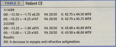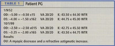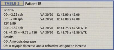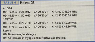 Table 4 describes the long-term results from a patient who wore aspheric multifocal corneal lenses that featured hyperboloidal base curves, which I fit 6.00D steeper than the flatter corneal meridian. The patient wore these lenses for 16 years. The refractive and corneal topographical changes do not have a direct mathematical relationship. I changed the OS contact lens to accommodate the induced refractive change.