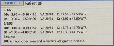 Table 3 describes the long-term results from a patient who wore corneal lenses for 33 years. I originally fit these lenses 4.00D flatter than K. I later refit the patient with aspheric multifocal lenses that featured paraboloidal base curves when the patient became presbyopic. I fit these lenses 4.00D steeper than K. This created a myopic decrease in conjunction with no direct mathematical changes of corneal curvatures.