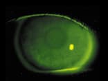 Soft lens patients may display diffuse corneal staining that begins in the inferior region of the cornea (the area closest to the tear meniscus) then works its way around the periphery, with the central cornea the last region affected (Figure 1). In GP solution sensitivity reactions, the corneal staining is often confined to the area underneath the lens or the central cornea, especially if the lens is fitted with apical clearance (Figure 2).