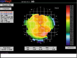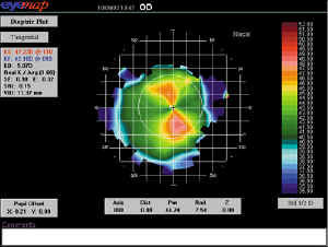 Dr. John Mountford from Australia presented a study that used a similar method of vector analysis, but with different results. This study identified a difference in astigmatic changes based upon the extent of astigmatism across the cornea visible on topography. When the "bowtie" was confined to the central pupillary zone (Figure 1), the astigmatism decreased on average by about 50 percent. When the "bowtie" extended beyond the pupillary zone toward the limbus (Figure 2), astigmatism increased on average; a spherical RG lens design was unable to correct this type. He concluded that the location and amount of the astigmatism is an important baseline predictor of success; clinicians should look for centralized astigmatism of less than 1.50DC for greatest chance of success.
