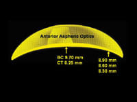 We then fit her with the reverse geometry soft lens design. This lens incorporates a flat central radius of curvature, 9.70mm, to align the flatter central cornea and a steeper mid-peripheral zone of 8.30mm, 8.60mm or 8.90mm to align the "more normal" mid-peripheral cornea (Figure 2). We tried diagnostic lenses with a 9.70mm central base curve , an 8.60mm mid-peripheral fitting curve and a 14.5mm overall diameter. Following equilibration, we evaluated the lens-to-cornea fitting relationship and performed a sphero-cylinder over-refraction. We ordered the following lenses: OD 9.70/8.60, +1.50 1.50 x 150, 14.5mm diameter and OS. 9.70/8.60, +4.75 4.00 x 20, 14.5mm diameter. The lenses were ordered with a center thickness of 0.25mm to mask the irregular astigmatism. Anterior aspheric optics were used to manage the spherical aberration and coma induced by the surgery. Ultimately, the patient's visual acuity with the lenses was 20/20 OU and stable throughout her 16-hour day.
