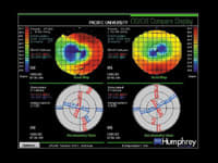 SZ is a 24-year-old female who underwent bilateral radial keratotomy in November 1998. Her pre-op refractive error was about 5.00D OU. Today, her manifest refraction is OD +1.50 1.50 x 150 20/20 and OS +4.75-4.00 x 20 20/25. K readings are OD 38.25 @172 /40.37 @ 82 (2+ distortion) and OS 35.50 @ 004 / 39.12 @ 94 (1+ distortion) (Figure 1). She was fit with several spherical and reverse geometry GP designs; however, she was unable to fully adapt to the lenses.
