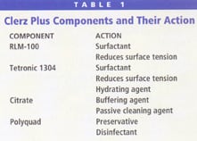 Alcon designed its Clerz Plus rewetting drops to lubricate and rewet the lens surface as well as to minimize protein deposition during lens wear. In addition to hydrating ingredients, Clerz Plus contains a combination of two active surfactants (RLM-100 and Tetronic 1304), a citrate buffer that provides passive cleaning activity and the preservative Polyquad (Table 1). RLM-100 is a weak anionic (negatively charged) surfactant with surface-acting performance and micelle-forming ability, which emulsifies and disperses soilants including proteins, lipids and calcium deposits through electrostatic bonding. This allows the drop to clean and wet the surface of the lens. Tetronic 1304 is a wetting agent that lubricates the surface of the lens and acts as a surfactant that provides cleaning action primarily through hydrophobic and hydrogen-bond interactions.