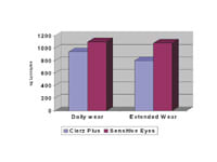 While subjective patient comfort and clinically evaluated lens cleanliness were essentially equivalent, high performance liquid chromatography (HPLC) analysis demonstrated significantly lower micrograms of lysozyme (p¾0.01) on lenses of patients using Clerz Plus in both the daily and extended wear groups as compared to those using Sensitive Eyes Drops (Figure 3). The Clerz Plus formulation inhibited deposition or removed protein accumulation to a greater degree (20 percent less on average) than did the Sensitive Eyes Drops.