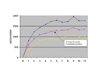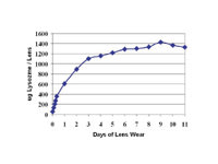 A recent study evaluated how protein deposited on contact lenses throughout the first hours and days of wear. Subjects wore Acuvue (Vistakon) lenses on an extended wear schedule and did not use lens care products during this study. The results demonstrated that protein accumulation generally appeared to reach a plateau after approximately one week of lens wear (Figure 1). However, individual deposit curves vary (Figure 2) and these individual differences are repeatable over time. Approximately 600µg of lysozyme deposits on Group IV lenses during the first 24 hours of wear. Another recent study demonstrated that clinical visual inspection of soft lenses during the first few weeks of wear does not help gauge lysozyme deposition on Group IV lenses. As practitioners, we must appreciate that, while the lenses our patients are wearing appear visibly clean, they are absorbing significant quantities of lysozyme that may cause both visual and anatomical problems. Keeping lenses clean throughout the day may minimize these problems and improve contact lens comfort.