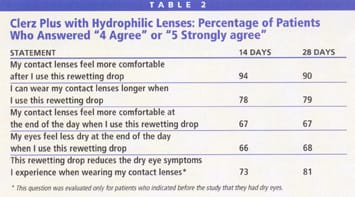 Table 2 summarizes the results for Clerz Plus with hydrophilic lenses. Patients positively rated the performance of Clerz Plus at day 14 and performance was maintained as lenses aged. Responses at day 28 were generally similar to those at day 14. Ninety percent of subjects using Clerz Plus in either treatment period agreed at day 28 that the Clerz Plus drop made their contact lenses feel more comfortable. Patients also determined that Clerz Plus helped prolong comfort throughout the day. A majority of patients agreed at day 28 that they "could wear their lenses longer" (79 percent), "lenses feel more comfortable at the end of the day" (67 percent) and "my eyes feel less dry at the end of the day" (68 percent) when using Clerz Plus.