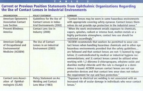 Many organizations have developed policy statements regarding contact lens wear in industrial environments. These organizations include the American Optometric Association (AOA), the American College of Occupational and Environmental Medicine (jointly with the American Academy of Optometry), the Contact Lens Association of Ophthalmologists (CLAO) and Prevent Blindness America (Table 2). The American Academy of Optometry, American Medical Association and American Public Health Association have no policy statements.