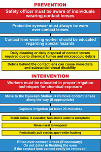 The National Institute for Occupational Safety and Health (NIOSH) also has a policy statement outlining the use of contact lenses in the chemical industry. A summary of their most recent policy statement suggests, "In general, a lack of injury data exists to clearly indicate that contact lens wear should be restricted when working with hazardous chemicals; however, appropriate eye protection is always necessary."