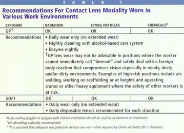 Contact lens wear in the work environment has been controversial for more than 40 years. The controversy is whether the potential for increased ocular risk in specific work environments overcomes the general advantages of lens wear. The type of work environment and the use of protective devices vary markedly among occupations. Some of the many factors associated with occupational ocular risks include exposure to radiant energy (ultraviolet [UV] exposure for welders, infrared [IR] exposure for iron or steel workers), flying particles and mechanical trauma (for construction workers), chemical exposures (for some laboratory workers) and allergenic factors (for gardeners and animal caregivers).