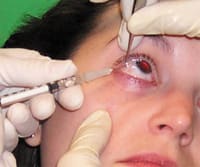 Once the needle penetrates the conjunctiva you may need to aspirate to prevent inadvertent application of medication directly into a blood vessel. Now inject the medication into the subconjunctival area, slowly pushing on the plunger to form a small, bulbous-like cyst reservoir of steroid.
