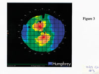 Figures 2 and 3 illustrate corneas for which the central K reading only tells part of the story. Figure 2 is from an eye that, by K reading alone, might lead you to think a spherical base curve would suffice. But look closely and you'll see that a spherical lens fit close to the flat K will be loose in the vertical meridian. Figure 3 illustrates a cornea that, by K reading alone, seems a candidate for a toric base lens, yet a toric base lens designed around the central K readings would fit steep and tight in the mid-periphery.