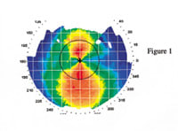 Fortunately we have tools available to guide us. Clearly fluorescein is the most precise and telling, but you can use topography as a faithful guide as well. Consider the three topographies shown here. Figure 1 indicates high astigmatism that is symmetrical, with an essentially even amount of astigmatism indicated from center to edge of the map. A lab can design a toric base curve lens using the K readings alone, as the periphery is simply a continuation of the central curvature.