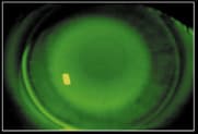 We fit DF's right eye with a reverse geometry GP lens with a central base curve radius of 37.00 diopters and the mid-peripheral fitting curve equal to the radius of curvature 4mm from center on the temporal side of the cornea (40.50 diopters). The combination of curvatures resulted in a lens that moved and positioned well on the cornea, and the fluorescein pattern revealed significant apical clearance (Figure 2). We dispensed the lens to DF and asked him to return in one week.