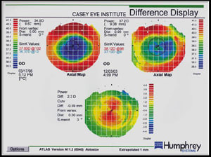 Videokeratography revealed that his central cornea had steepened, with simulated Ks of 37.12 @ 006/38.12 @ 096 and an apical radius of 37.25 diopters. The difference display map shows the 2.37D of central steepening that occurred from 1998 to 2003 (Figure 3). Whether this resulted from normal post-LASIK regression or from the inadvertent apical clearance lens design, we'll never know.