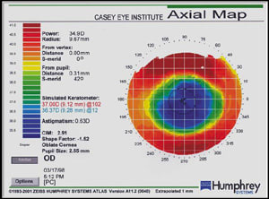 Patient DF, a 38-year-old male, underwent bilateral LASIK in February 1998. His preoperative refractive error was OD 5.50 1.25 x 010 and OS 5.00 1.00 x 180. Postoperatively, his manifest refraction was OD +2.75 0.75 x 005 20/20 and OS +0.50 0.25 x 180 20/20. Simulated keratometric readings on the right eye were 36.37 @ 012/37.00 @ 102 with a central apical radius of 35.00 diopters (Figure 1).