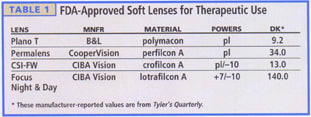 What's been your lens of choice for bandage lens use? Was it your favorite one- to two-week disposable lens, or a conventional vial lens? Did the FDA approve it for this purpose or have you used as an off- label? As of May 2003, we now have one silicone hydrogel lens that the FDA has approved for therapeutic use: CIBA Vision's Focus Night & Day lens, approved for protection of the corneal surface and relief of pain in acute or chronic ocular pathology or post surgical lens use. The lens is now available in plano for these purposes. In fact, it's the only disposable lens that the FDA approved for therapeutic use (Table 1).