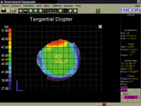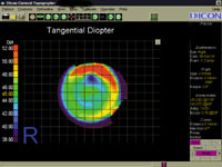 After 14 months of wearing 8.4mm base curve, 9.00D Focus Night & Day lenses in each eye, the neovascularization had completely regressed. However, she complained of poor distance vision, which she could improve by wearing reading glasses over her contact lenses. Her refraction was now OD 7.50 0.75 x058, OS 7.75 1.00 x030. Figures 1 and 2 show her post-fitting maps.