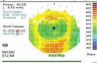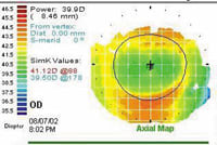 Distance visual acuity was 20/20 in the right eye with no correction, 20/25 with a soft toric contact lens in the left eye and 20/20 OU. I noted the following manifest refraction: OD: 0.25 sphere with 20/15 acuity and OS: 5.25 2.50 x 180 with 20/15 acuity. Corneal topography revealed a well-centered oval treatment zone in the right eye. The horizontal treatment zone was approximately 5.5mm in diameter; however, the diameter of the treatment zone was only approximately 4 mm in the vertical meridian (Figure 1). The small diameter of the vertical treatment zone was likely the cause of some of the glare and halo problems the patient was experiencing.