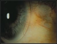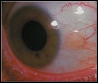 While pingueculae are often clinically insignificant, they can create some challenges when fitting contact lenses. With GP and soft contact lenses, small pingueculae present few fitting and/or wearing problems (Figure 3). However, large, elevated lesions can result in an undesirable bridging of the upper lid, making GP lens wear more difficult. Additionally, elevated lesions can result in excessive soft lens edge lift as the lens attempts to extend across the lesion. We prefer low-modulus soft lenses (softer materials) because they'll better conform to the shape of the pingueculae.