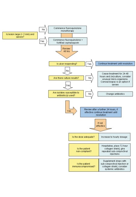 Commence fluoroquinolone monotherapy immediately. If the condition rapidly worsens, then modify treatment based on the clinical response and, if available, culture results (Figure 2). If the lesion responds within the first two days, then continue therapy until the eye becomes quiet.