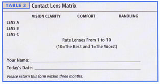 For example, I typically say something along the lines of, "You might like the crispness of your vision with Brand A contact lenses and rate that a 10, but those lenses may tear easily and score only a one or two overall. Or you might like the comfortable feeling of Brand B, especially toward the end of your wearing day, but it just doesn't provide the clarity you need while driving home from work at night." Experiencing different contact lenses will help them choose the lens brand that best meets their needs.