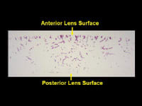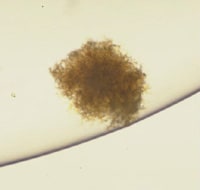 Microorganism growth refers to a wide range of fungi or yeast formations that can attach to and ultimately infiltrate soft contact lens materials. Under low magnification, the growths appear as brown, pink, orange, black or off-white spots, with fuzzy ill-defined boundaries (Figure 1). Under higher magnification, the lesions exhibit filamentary arms (hyphae) that penetrate and grow throughout the soft lens matrix (Figure 2). Histological staining for fungi reveals that the organisms permeate the entire lens matrix from surface to surface (Figure 3).