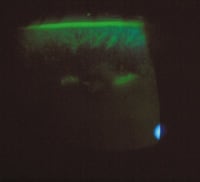 Biomicroscopy will reveal arc-like or horizontal whitish lesions 2mm to 3mm from the corneal limbus, under the upper eyelid. The lesions represent full thickness epithelial breaks, which may form a point of entry for an infiltrative event or eventual subsequent scarring. More readily visible after instillation of sodium fluorescein dye and further enhanced using a yellow barrier filter (Figure 1), SEALs exhibit a delayed streaming (glow) resulting from the disrupted corneal integrity.