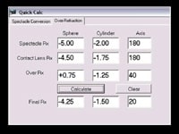 After you apply the diagnostic lens and allow it to settle, perform a sphero-cylinder over-refraction. Click "over-refraction" to enter this third variable. The program then calculates the final prescription (Figure 1). In this example, the patient requires a lower sphere and cylinder power in addition to a modified axis based on the cross cylinder effects from a lens that rotates.