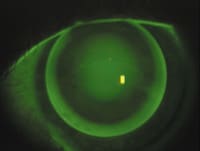 Unlike the original LifeStyle GP Design, which must position superiorly central to perform adequately (in fact, its original name was the Hi-Rider lens), the Marquis must center over the pupil in primary position, then translate slightly when the patient's eyes move to the reading position. Figure 1 shows the fluorescein pattern of a successful fit.