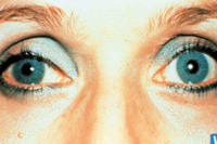 Figures 1 (top) and 2. Opaque prosthetic contact lenses helped restore this patient's confidence in her self image after her right eye was scarred by