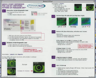 Many valuable CRT fitting resources are available. Paragon offers an Initial Lens Selector and a Quick Start Reference card (Figure 2) for use by certified fitters of Paragon CRT. The Initial Lens Selector helps practitioners determine the correct lens parameters with which to begin the fitting process. The Quick Start Reference card offers tips on achieving the correct fit and troubleshooting.