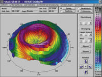Figure 2 shows the change in corneal shape over a period of time. The ability to "push" the astigmatism outside the pupil zone is what makes this design superior to spherical lenses. The original prescription for this patient was 1.75/2.00 @ 180. The final prescription was +0.25D sph (20/15). Figure 3 shows a dramatic change from 3.75/3.00 @ 8 to +0.25/0.50 @ 8.