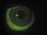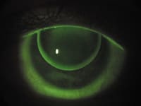 Fortunately, it's not necessary to perform intensive calculations to determine the right amount of edge lift. You can gauge the effectiveness of the edge lift in a lens by observing the peripheral fluorescein pattern and positioning of the lens. Figures 1 and 2 show two lenses that are identical except that the edge lift in Figure 1 is 0.07mm and in Figure 2 it's 0.16mm. If the peripheral pooling is thin and/or the lens drops too quickly from the lid (Figure 1), then have the lab increase the amount of edge lift; conversely, if the lens shows a wide peripheral pattern and/or it lid-attaches too well (Figure 2), then have the lab decrease the edge lift. As a rule, have the lab change the edge lift in 0.03mm steps for a significant change.