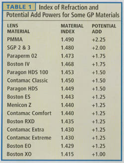 Table 1 shows the refractive index and potential add power for a number of common GP materials. It appears that as the fluorine content of a material increases, the refractive index decreases. For example, a non-fluorinated polymer such as Boston IV (Dk 19) has a refractive index of 1.468, and a potential add power of +1.75D. The fluoro-silicone-acrylate Boston ES (Dk 18) has a lower refractive index of 1.433 that results in a lower potential add power of +1.25D.