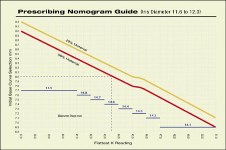 A simple nomogram is available for corneal diameters between 11.6mm and 12.0mm (Figure 1). Measuring the flat K will determine the lens diameter and optimal base curve with 59 percent hioxifilcon A and 49 percent hioxifilcon B materials. This fitting nomogram can predict the lens parameters without going through calculations to determine the lens specifications. It helps customize soft contact lens fitting.