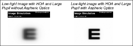 Figure 3 shows an image simulation of a convoluted "E" that represents the effects of spherical aberration and its correction using aspheric optics. However, not all patients will perceive this dramatic a difference in their visual quality with aspheric optics. The amount of "night myopia" differs among individuals. On average, it's about 0.50D, but some patients may have as much as 1.25D of night myopia. Although its effects are subtle, details around streetlights and automobile headlights are blurred. The aspheric optics of the PureVision contact lens can help improve such quality of vision by increasing contrast sensitivity and image crispness in a majority of patients.