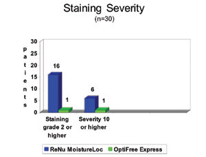 Figure 2. Staining severity scores for ReNu with MoistureLoc and Opti-Free Express. |