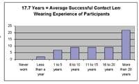 Of the 60 subjects recruited for the evaluation, 11 were male and 49 were female, all ranging in age from from 43 to 71, with an average age of 52.2 years. Overall, these were experienced contact lens wearers, with an average of 17.7 years of contact lens wearing experience (Figure 1). An average pupil size of 4.17mm was reported with a range of 2mm to 6mm.
