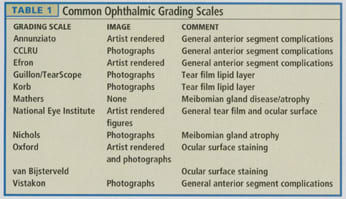 We can improve the reliability of clinical grading in several ways. We could attempt to objectify clinical measurements. For instance, many studies and techniques have objectified traditionally subjective measurements such as bulbar hyperemia and tear breakup time. We could also train examiners, which often occurs during a practitioner's clinical training or at the outset of a new study. Lastly, we could use grading scales, which provide some standardization to the clinical grades, especially between examiners. Table 1 shows some of the grading scales available.