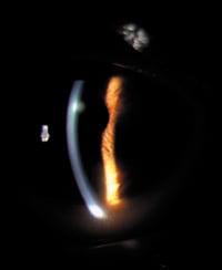 A 19-year-old college student first presented to our practice with complaints of left eye blur, photophobia and irritation of four-days duration. He discontinued GP contact lens wear with the onset of symptoms. He hadn't seen his previous eyecare practitioner in four years. The right GP contact lens was four years old, and he'd replaced the left GP lens three months prior after breaking it. The original practitioner hadn't evaluated the contact lens fit or ocular health in four years and sent the new GP lens without a health assessment. The patient had worn the contact lenses on an overnight bus trip five days earlier and experienced some irritation the following day. Slit lamp examination revealed a 0.5mm superior-central infiltrate with overlying stain on the left cornea (Figure 4). Visual acuity with spectacles was 20/15 OD and 20/50 OS. Pinhole acuity was 20/30 OS. We presumed that the infiltrate was a sterile corneal ulcer because of the lack of anterior chamber reaction, significant pain or photophobia after four to five days of onset. We prescribed a fourth-generation fluoroquinolone and instructed the patient to return the following day.