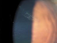 Case 1, Visit 2 Our patient cancelled her first appointment and returned two weeks later, reporting less redness and no irritation OS. The large corneal infiltrate showed significant improvement, was mildly elevated, had trace staining and was vascularized throughout. We noted a small intracorneal hemorrhage at this visit (Figure 2). We instructed the patient to continue the ocular lubricant and to discontinue the steroid. We advised her to return in one week for a comprehensive examination and contact lens fitting.