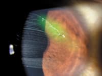 A 20-year-old college student presented with a 30-minute history of mild pain and mild blur of the left eye. He expressed concern that he had given himself a paper cut on his eye. Visual acuity OS was 20/25 and the pain was a 4 on a scale of 1 to 10. Slit lamp biomicroscopy revealed a superficial abrasion over the left pupil with a jagged diagonal epithelial defect consistent with a paper cut (Figure 5). We applied a bandage contact lens to reduce the pain and to protect the corneal epithelial cells from the eyelid. We also prescribed a topical fluoroquinolone.