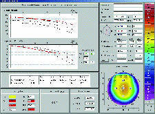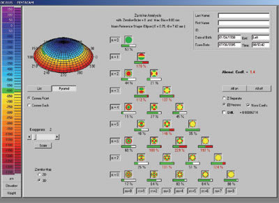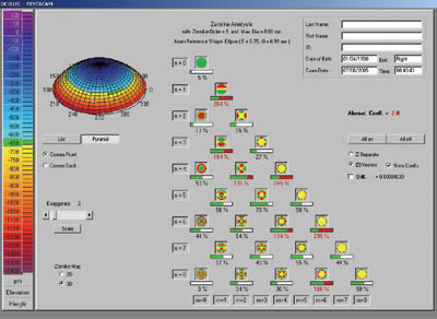 Fluorescein simulation fitting programs, keratoconus detection software and 3-D color mapping are able to send information directly to your contact lens labs via the Internet. New models such as the Oculus Pentacam (Oculus Optikgeräte GmbH) use Scheimflug camera systems that show both anterior and posterior corneal topography, limbal to limbal pachymetry and analysis of Zernike polynomial higher-order aberrations. Other instruments, such as the ReeSeeVit Focus Wave Front topographer (Veatch Ophthalmic Instruments), feature the combined ability of autorefraction, corneal mapping and wavefront aberrometry measurement.