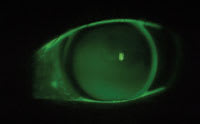 In 1999 we switched LD into a GP translating design originally in Boston ES, now in Boston EO (Bausch & Lomb) material in the following prescription: OD 7.50 –5.50 9.5/9.2 4.5 segment height 1.5 prism +2.50 add 20/20 distance and near, OS 7.50 –4.75 9.5/9.2 4.5 seg. ht. 1.5 prism +2.50 add 20/20 distance and near (Figure 1). Her manifest refraction was OD –6.00 –1.00 x 075 20/20 +2.75 add Jaeger 1, OS –5.25 –1.25 x 105 20/20 +2.75D add Jaeger 1. Her Ks and topography were OD 45.25/46.00, OS 45.00/46.00, clear mires.