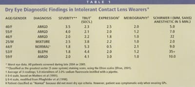 Several evaluations for the dry eye screening study involved referrals from the contact lens service, which referred the patients because they were having significant difficulty in successfully wearing their lenses. Table 1 provides characteristics of a small, recent sample of these subjects. It appears that, as with the larger dry eye group, the majority of intolerant contact lens patients (six out of seven) also have dry eye related primarily to meibomian gland disease. This reinforces the idea that we must, as clinicians, evaluate the meibomian glands as part of a broader dry eye workup in intolerant patients.