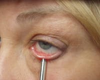 Figure 3.Clinical meibography using transilluminator to evert the lower lid. |